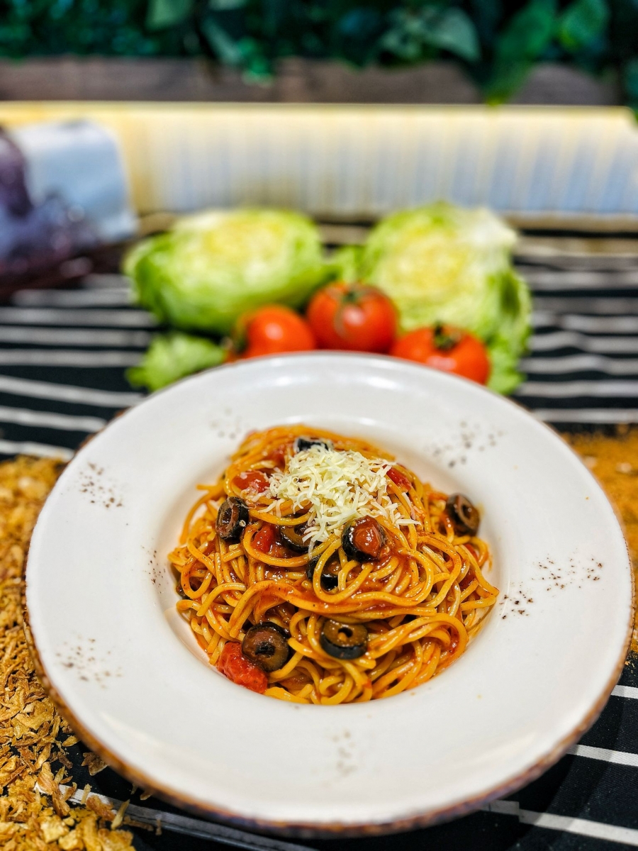 Domates sos ,file zeytin ,srriacha sos ,tuz,karabiber,pulbiber,fesleğen spagetti makarna.